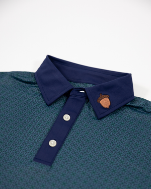 The Glenhaven is inspired by the calm of wooded fairways and early morning rounds. Featuring a rich green geometric pattern and our signature acorn embroidery placed subtly on the collar, this piece ties the identity of Acorn Hills directly into the design. Built with lightweight, moisture-wicking performance fabric and finished in a standard fit that moves comfortably with you.